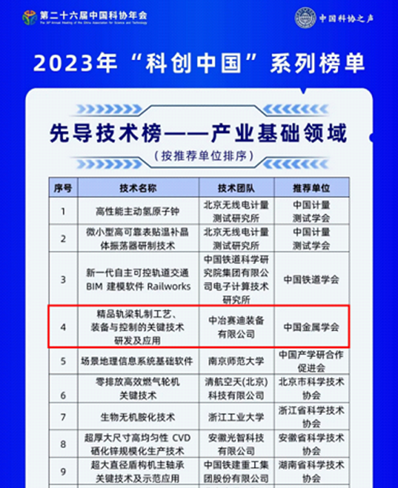 中冶賽迪軌梁軋制科技成果榮登“科創(chuàng)中國”先導技術(shù)榜單